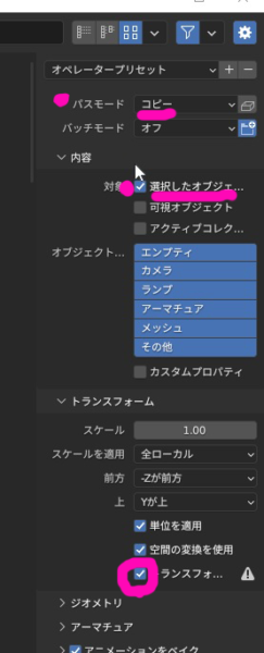 もちろん、エクスポート前にはCtrlAでスケールなどの適用をしていたと思うのですけど、エクスポート設定でもここに☑するんですね。