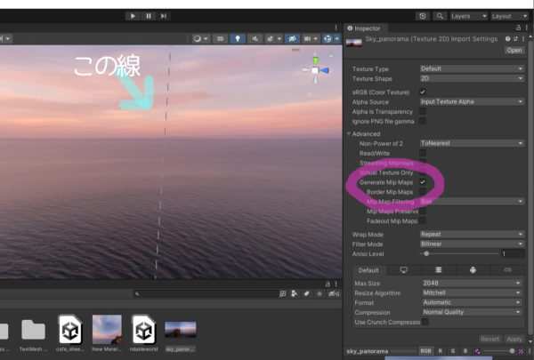Generate Mip Mapsの☑をはずして、Apply押したらすんなり消えました!