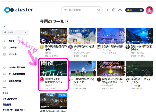 ええと、それでclusterのワールドなんですが、デイリーピックアップが終了した後、なんとウィークリーピックアップというものにも取り上げていただいてます!!!