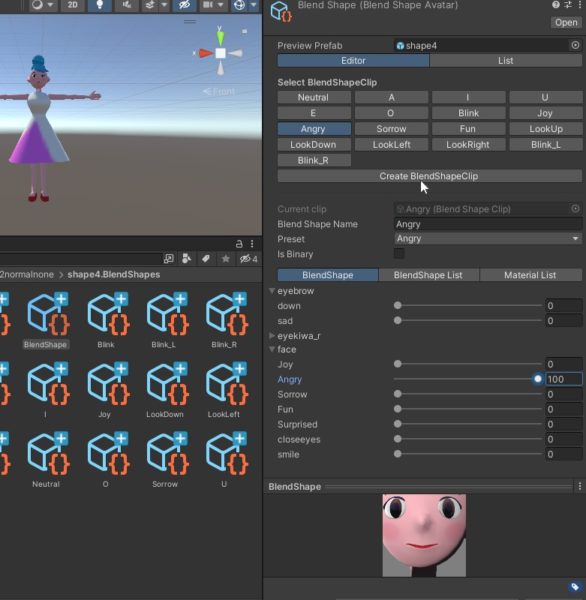 リップシンクとか表情とか作るものなんですけど、これ、設定してFBXでエクスポートしてUnityでインポート、VRMにエクスポートしてファイルを作成、Inspector、VRMBlend Shape ProxyのBlendShapeでシェイプキーを使えるはずなのですが。。