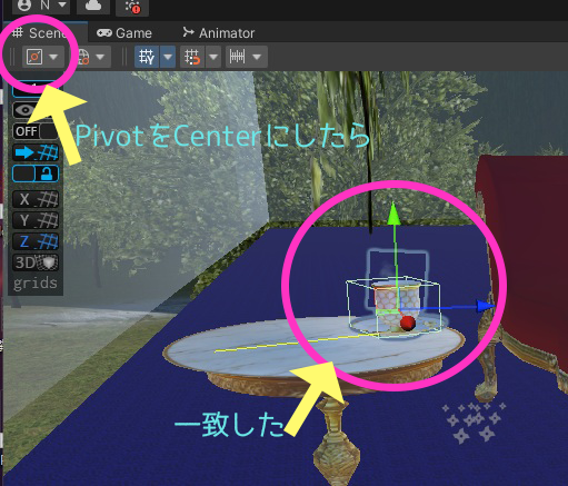 なんとですね、ウィンドウの左上のところ、矢印クリックでPivotとCenterが選択できるようになってるんですけど、それがPivotになっていたのをCenterにしたら。