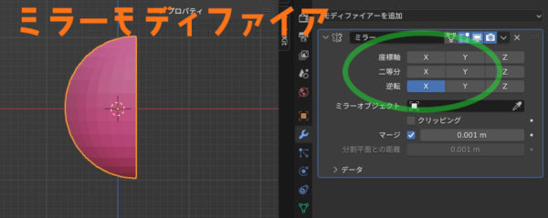 で、半分だけ作って左右対称にしたい場合はx軸(これまた悩むところですけど結局覚えられずいろいろやってちゃんと形になるのを選ぶっていう)で、