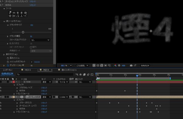結局ブラシツールで最終的にかかってほしいところに乱気流ツールで手動でゆがませます。でタイムラインにキーを打つためにはディストーション率(ゆがみの強さらしい)を使います。