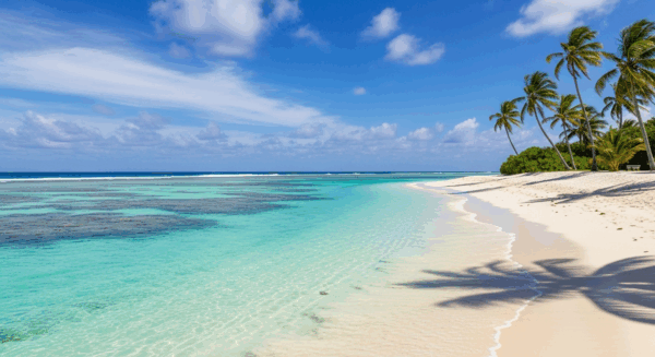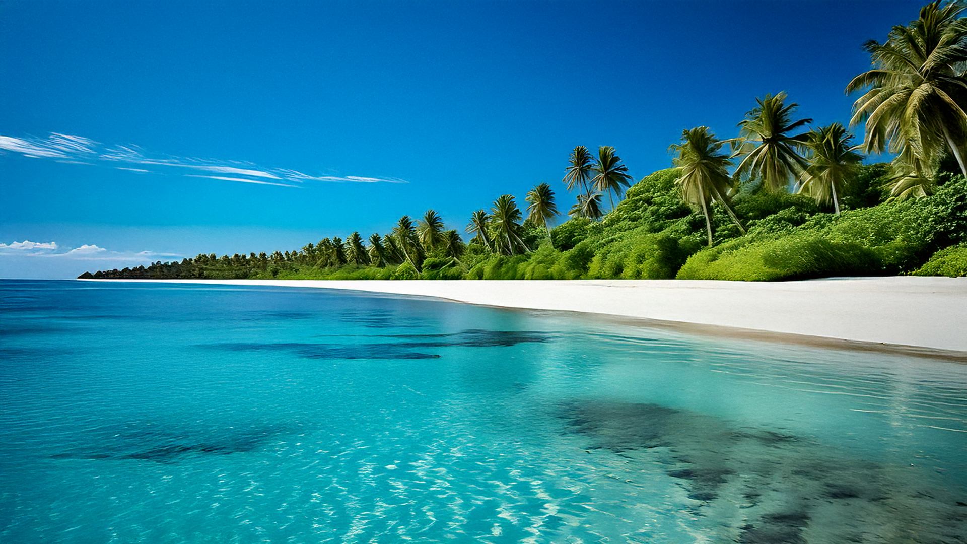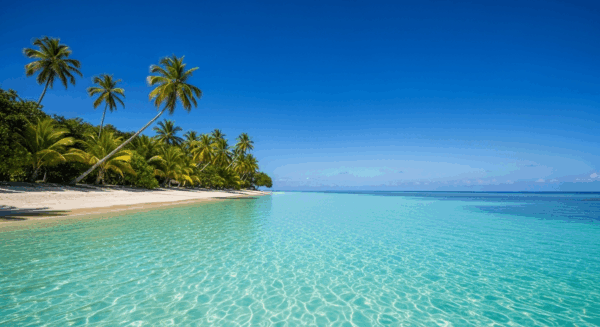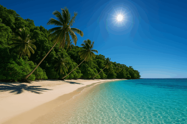 ((crystal‑clear turquoise water)), ((deep blue sky)), ((harsh midday sun)), ((palm trees)), ((no people))